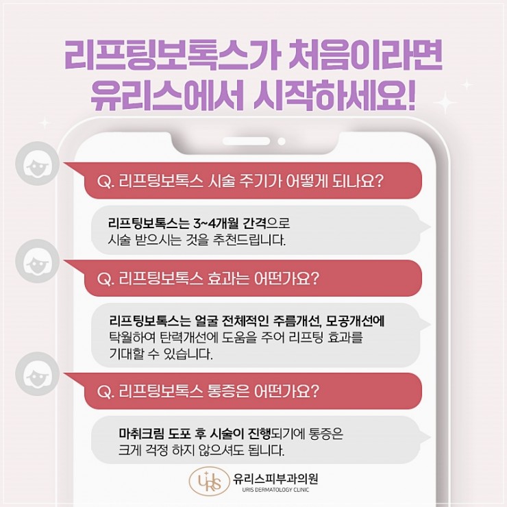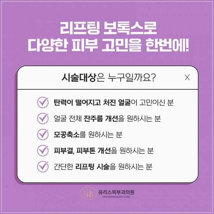 보톡스의 핵심 성분인 **보툴리눔 톡신(botulinum toxin)**은 근육의 움직임을 일시적으로 완화시켜, 반복되는 표정으로 인한 주름 형성을 예방하고 이미 생긴 주름을 완화시킵니다. 특히 이마, 미간, 눈가, 입가, 팔자주름 등 자주 사용하는 근육 부위에 효과적이며, 자연스러운 표정은 유지하면서도 불필요한 주름만 줄이는 것이 특징입니다. 리프팅 보톡스는 단순히 근육층에 작용하는 일반 보톡스와 달리, 진피층과 피하조직의 탄력 회복을 함께 유도합니다. 피부 깊숙이 미세하게 주입되어 콜라겐 재생을 촉진하고 피부결을 매끄럽게 정돈하는 역할을 하기 때문에, 마치 레이저 리프팅을 받은 듯한 탄력 효과를 얻을 수 있습니다. 또한 주사 시술 특성상 개인별 근육 구조나 피부 두께에 따라 세밀하게 조절이 가능하므로, 표정이 부자연스러워지지 않고 본연의 인상을 유지한 채로 개선이 이루어집니다.