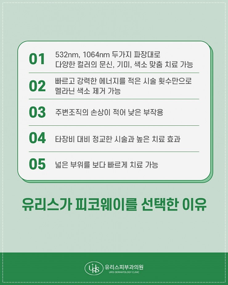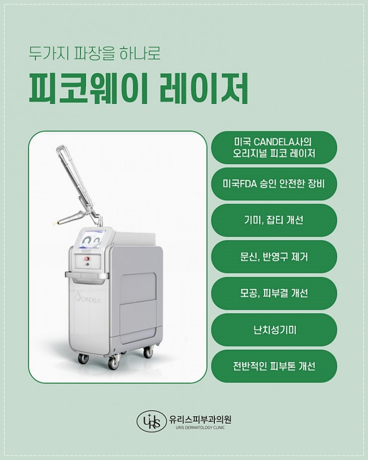 피코웨이(PicoWay): 피코초 단위의 초정밀 레이저로, 색소 입자를 미세하게 파괴해 정상 피부 손상 없이 깨끗한 개선 효과를 제공합니다. 기미와 주근깨, 오타모반 등 다양한 색소질환에 적용됩니다.