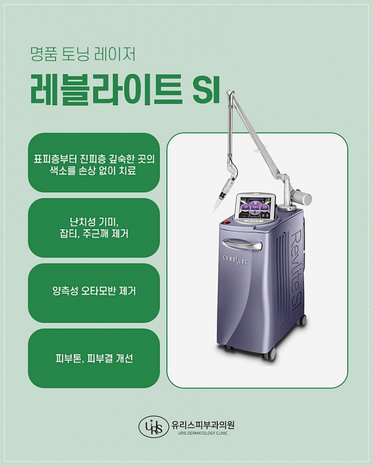 레블라이트 SI: 균일한 에너지로 색소를 고르게 분해하며, 피부톤 개선과 동시에 탄력 및 광채 효과를 부여합니다.