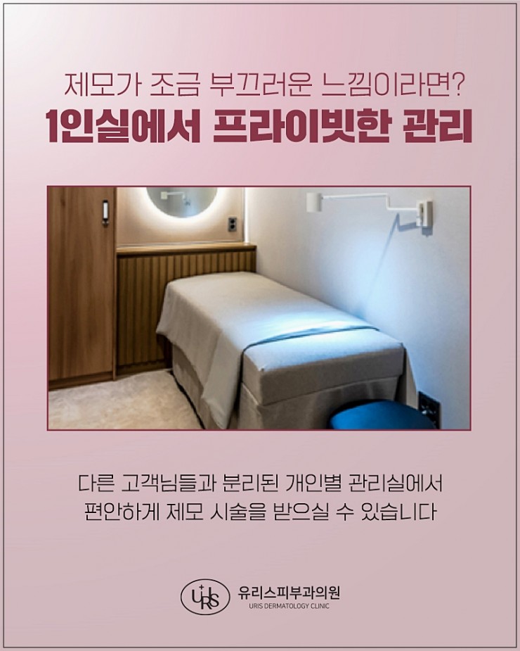 유리스피부과의 제모는 단순히 기계에 의존하지 않습니다. 피부과 전문의가 상주하며, 환자 개인의 피부 타입·모발 굵기·색소 농도를 세밀하게 진단한 후 레이저 에너지를 조절해 시술합니다. 이는 주변 피부조직의 손상을 최소화하면서 모낭에만 집중적으로 작용할 수 있는 안전한 방법입니다. 또한 모든 시술은 1인실에서 진행되는 프라이빗 시스템으로, 타인과 마주치는 불편함 없이 편안하게 제모를 받을 수 있습니다. 얼굴, 팔, 다리, 인중, 겨드랑이, 비키니라인 등 민감한 부위도 프라이버시가 철저히 보장되며, 시술 후에는 빠른 진정케어가 함께 진행되어 붉은기나 건조함을 최소화합니다.
