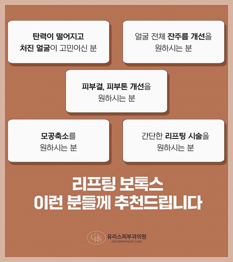 주입하는 리프팅 보톡스(스킨 보톡스·더모톡신) 을 시행합니다. 피부층에 얕고 균일하게 주입하면 모공이 조여지고