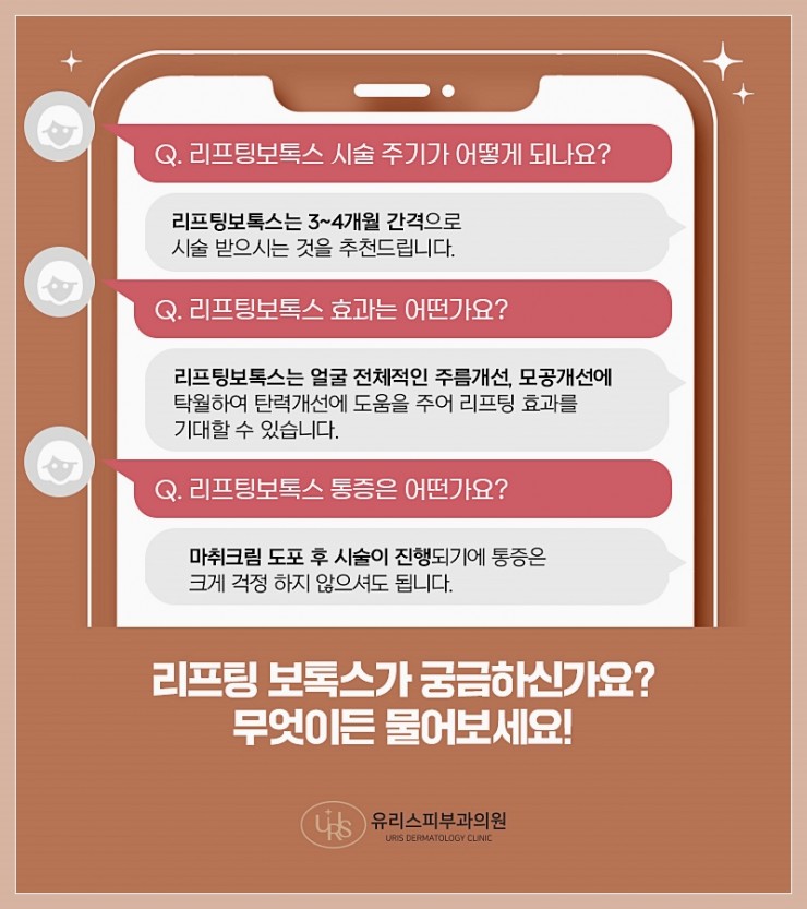 유리스피부과는 시술 목적과 부위에 따라 보톡스 종류와 주입 깊이를 다르게 설계하여, 효과는 극대화하고 부작용은 최소화합니다. 덕분에 보톡스가 단순 미용이 아닌 생활의 불편을 줄이는 기능적 치료로도 활용되고 있습니다.