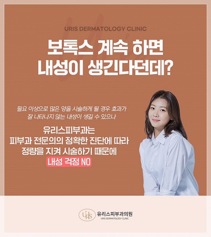 보톡스 시술에서 가장 많이 받는 질문 중 하나가 바로 **‘내성’**입니다. 내성은 인체가 특정 성분에 적응해 효능이 떨어지는 현상으로, 같은 용량을 맞아도 효과가 약해지거나 지속 시간이 짧아질 수 있습니다. 유리스피부과에서는