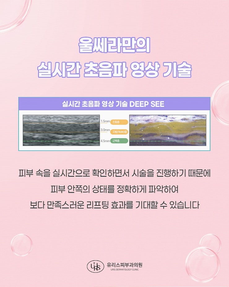 울쎄라 시술에서 가장 중요한 것은 어디에, 어떤 깊이로, 얼마나 에너지를 조사하는가입니다. 용인·성복동 유리스피부과에서는 울쎄라의 장점 중 하나인 **DeepSee 기술(실시간 초음파 모니터링)**을 활용해 피부 속 구조를 직접 확인하면서