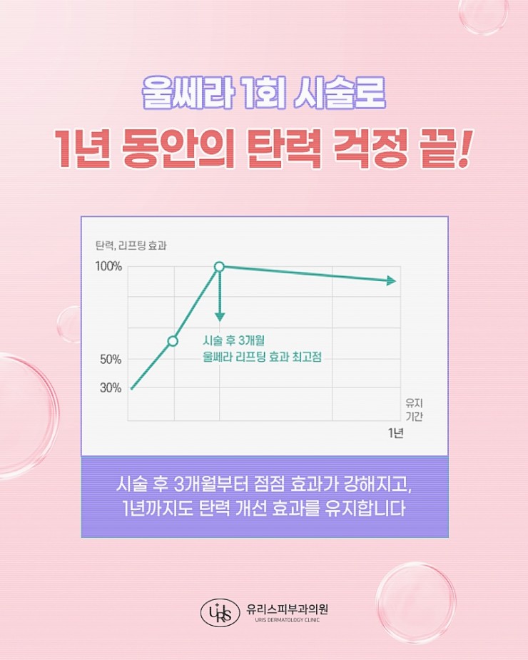 울쎄라의 장점은 즉시 느껴지는 당김 효과와 장기간 지속되는 탄력 증가입니다. 열