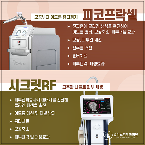 모공 치료는 한 가지 시술만으로 해결되기보다는 피부 상태에 따라 여러 방법을 병행하는 경우가 많습니다. 대표적으로 피코프락셀은 미세한 레이저 빔을 피부에 조사해 콜라겐 재생을 유도하고, 모공과 흉터를 동시에 개선하는 데 도움을 줍니다. 시크릿RF는 고주파 에너지를 진피층까지 전달해 과도한 피지 분비를 조절하고, 모공