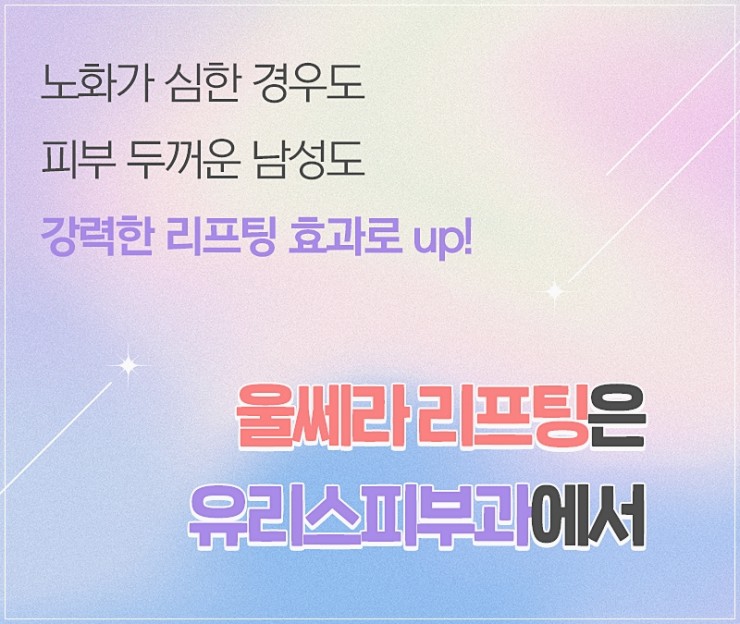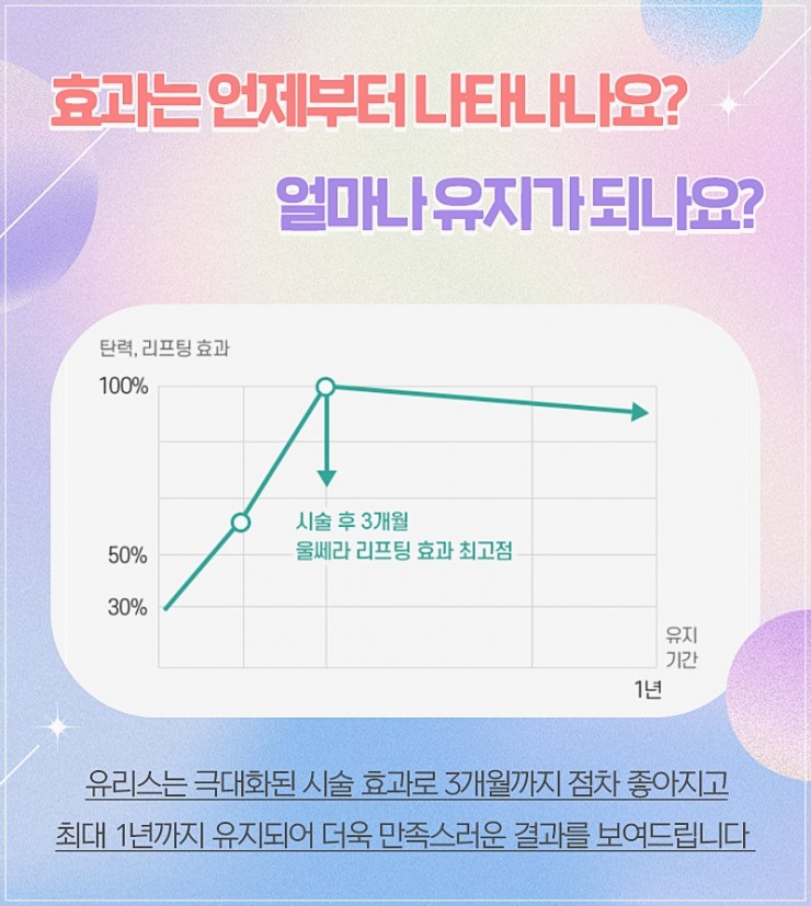 걸쳐 서서히 좋아졌다고 느껴지는 이유도 바로 이 리모델링 과정 때문입니다. 즉, 울쎄라는 즉각적인 당김 효과와 더불어 장기적인 탄력 개선을 동시에 목표로 하는 시술이라고 볼 수 있습니다.