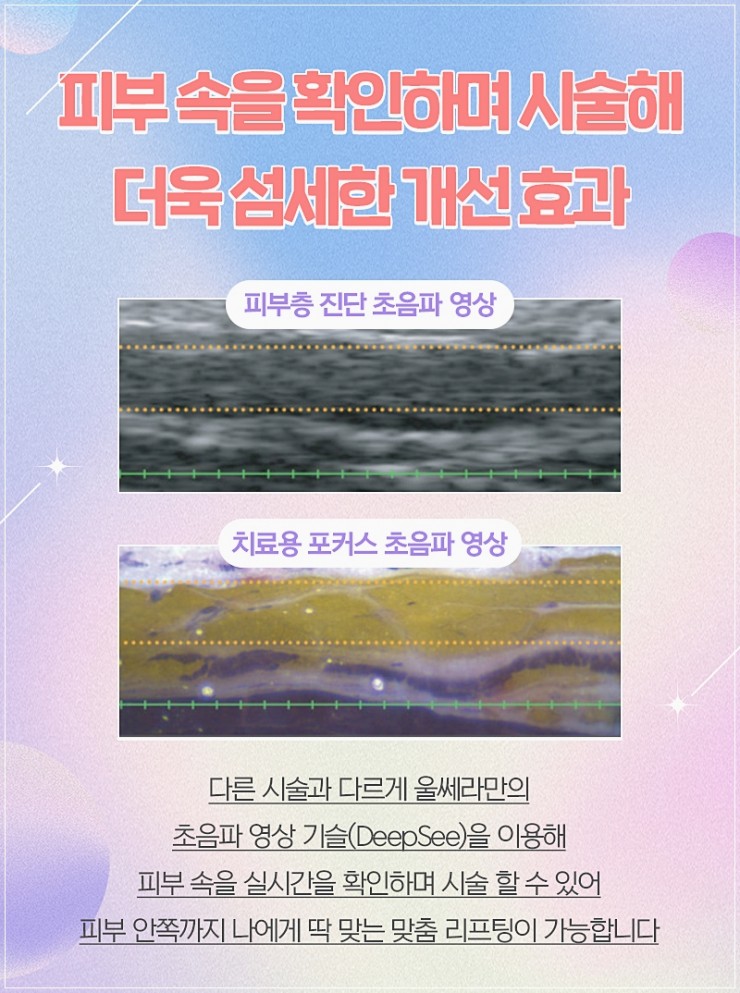 울쎄라는 실시간 초음파 영상 기술을 통해 피부 속 구조를 직접 확인하면서 시술이 가능한 장비입니다. 이를 통해 근막층, 진피층, 피하지방층의