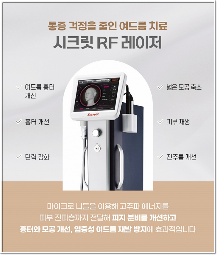 흉터는 피부 구조 자체가 꺼진 상태이기 때문에, 단순 레이저만으로는 한계가 있으며 서브시전이나 피코프락셀, 시크릿RF 등 진피 재생을 유도하는 치료가 필요할 수 있습니다. 동천동 여드름치료에서는 흉터 형태에 맞춰 복합적으로 접근하는 것이 핵심입니다.
