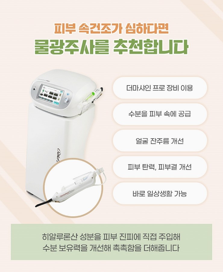 전달하는 스킨부스터가 효과적인 선택이 될 수 있습니다. 풍덕천동 스킨부스터는 히알루론산이나 PN 성분 등을 진피층에 주입해 피부 속 수분감을 빠르게 회복시키고 콜라겐 생성을 유도하는 방식입니다. 리쥬란힐러는 고농도 PN 성분을 통해 손상된 피부 구조를 회복시키고, 피부 자체의 재생력을 끌어올리는 데 초점을 둡니다. 쥬베룩은 고분자 PLA와 히알루론산을 결합해 서서히 콜라겐 합성을 촉진하며 자연스러운 볼륨과 탄력 개선을 기대할 수 있습니다. 물광주사는 더마샤인 프로 장비를 활용해 진피층에 균일하게 수분을 주입함으로써,