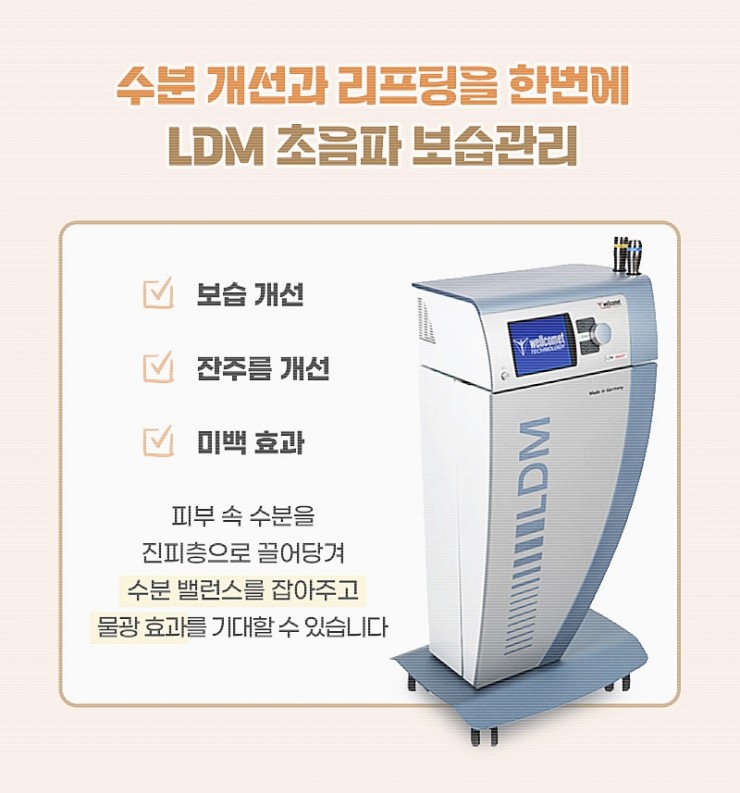 흐르더라도 통증 부담이 적고 피부 손상을 줄일 수 있다는 점이 특징입니다. LDM 초음파 장비는 피부