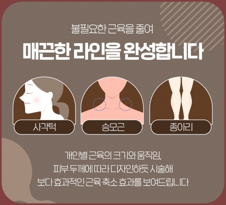 일반적으로 알려진 것은 근육층에 주입하는 근육 보톡스로, 턱 근육이나 승모근, 종아리 등의 근육을 자연스럽게 축소하는 데 사용됩니다. 이 외에도