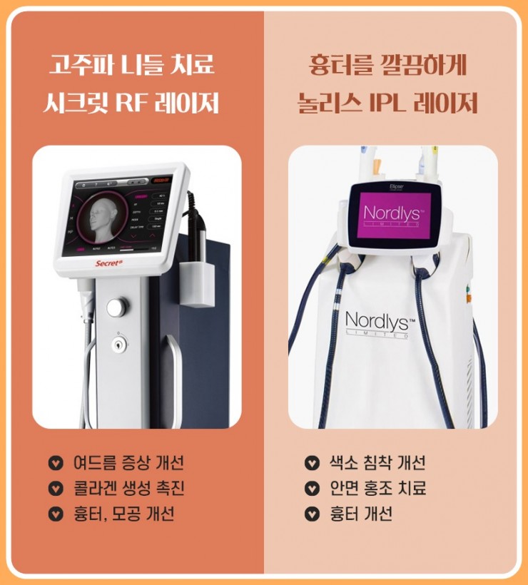 이미 여드름 흉터가 발생한 경우에는 단순한 피부 관리만으로 개선하기 어렵기 때문에 레이저 치료가 활용될 수 있습니다. 피코프락셀이나 고주파 니들(RF) 장비는 피부 재생을 유도하고 콜라겐